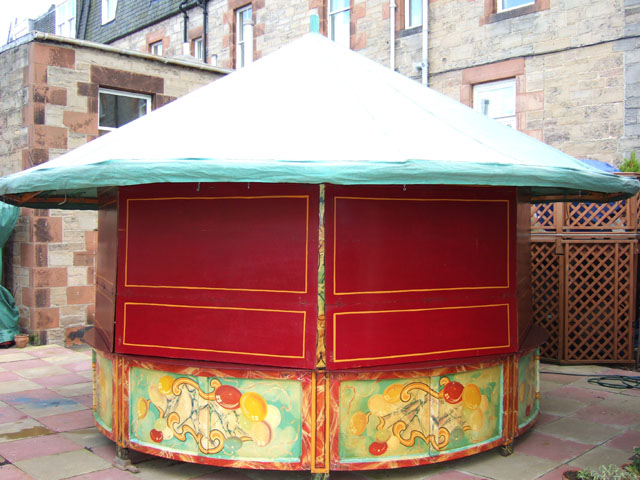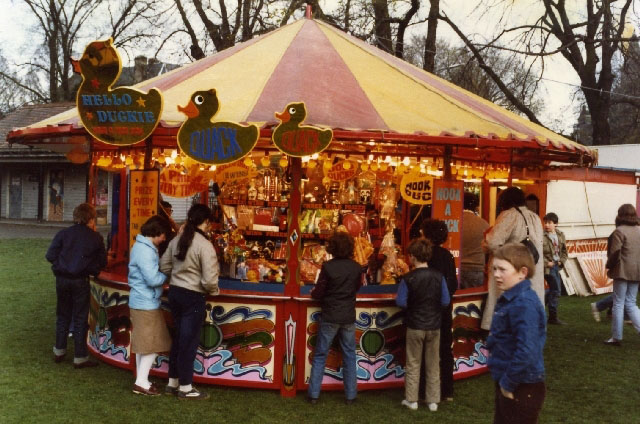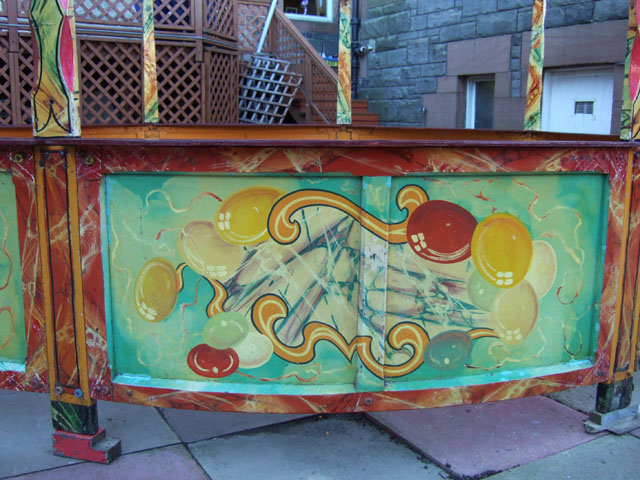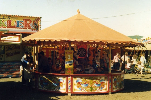 Round stalls have always been popular on British fairgrounds. They are generically named “Hooplas” after the popular game of throwing hoops over a wooden block on top of which sat your prize. The hoops were often only minutely smaller than the wooden blocks so winning was not easy! Other games played in these round hoopla stalls were Roll a penny, Beat the clock, Hook a Duck, Throwing a table tennis ball into a goldfish bowl, Roll a ball, Stand up the bottle and even Darts (which seems odd in a round stall if people have poor aim!) There is something quaint about a round stall and many have been in the same families of showpeople for generations. By today’s standards they are quite a lot of work to build up because there are a lot of trailer mounted alternatives, but it is pleasing to see that there are quite a lot of these stalls still in existence and hopefully they will be around for a long time to come as they do add a special atmosphere to our fairs. The stall is similar to (and could well be) a standard version made by a company called Marklands. Its exact age and origins are uncertain but I know that it is at least 30 years since it was last decorated with the balloons and streamers design, so it is presumably a good deal older than that. |